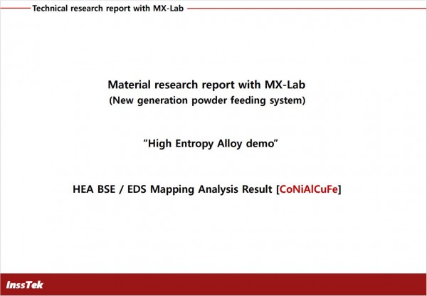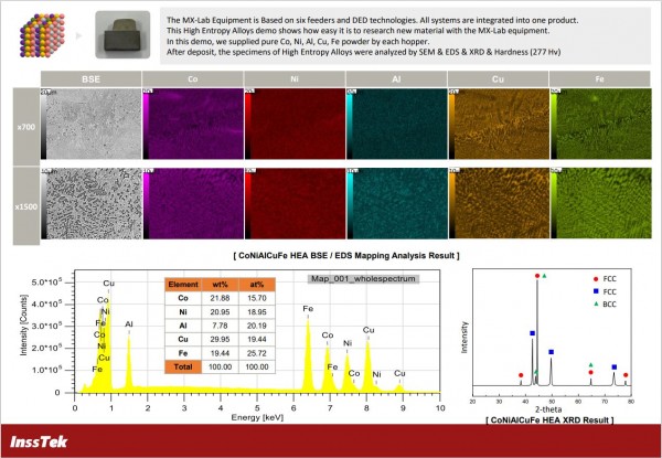 The MX-Lab Equipment is Based on six feeders and DED technologies. All systems are integrated into one product. This High Entropy Alloys demo shows how easy it is to research new material with the MX-Lab equipment. In this demo, we supplied pure Co, Ni, Al, Cu, Fe powder by each hopper. After deposit, the specimens of High Entropy Alloys were analyzed by SEM & EDS & XRD & Hardness (277 Hv)