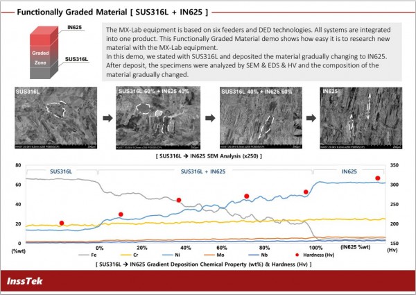 In this demo, we stated with SUS316L and deposited the material gradually changing to IN625.
