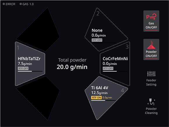 Feeding rate range : 0.03-2.0g/min (Based on Ti-6Al-4V) The number of powder hoppers : Max. 6